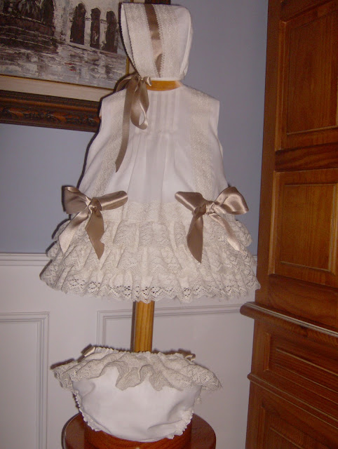 Después de presentaros tantos vestiditos de Helena llega el momento de Claudia. Es un modelo realizado en piqué y algodón estampado. Los adornos le dan un toque muy dulce: picunela de terciopelo y puntilla de bolillos para hacer de este modelo algo diferente. Además la capotita y el cubrepañal son una monada. Espero que os guste...